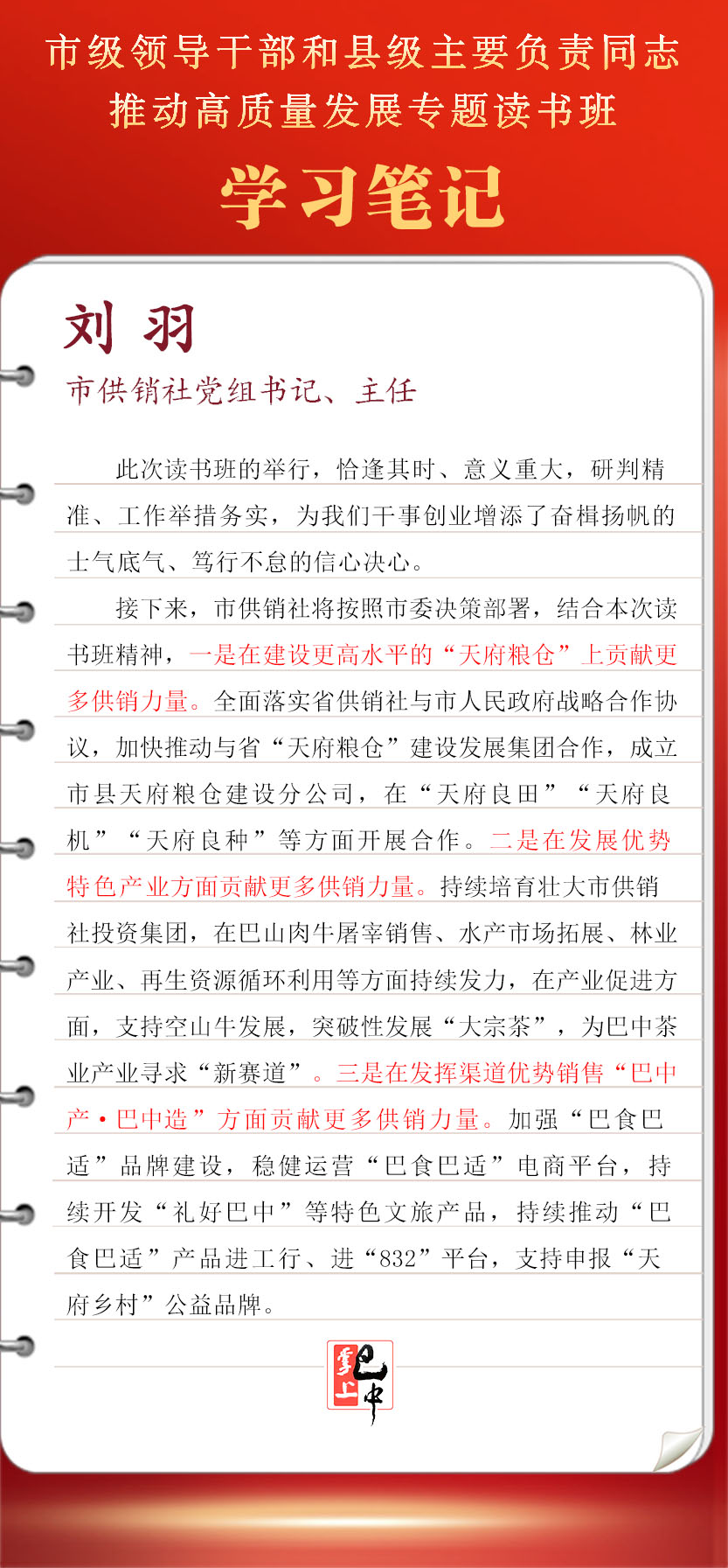接下來,市供銷社將按照市委決策部署,結(jié)合本次讀書班精神,全面落實省供銷社與市人民政府戰(zhàn)略合作協(xié)議,加快推動與省“天府糧倉”建設(shè)發(fā)展集團合作,成立市縣天府糧倉建設(shè)分公司,在“天府良田”“天府良機”“天府良種”等方面開展合作。持續(xù)培育壯大市供銷社投資集團,在巴山肉牛屠宰銷售、水產(chǎn)市場拓展、林業(yè)產(chǎn)業(yè)、再生資源循環(huán)利用等方面持續(xù)發(fā)力,在產(chǎn)業(yè)促進方面,支持空山牛發(fā)展,突破性發(fā)展“大宗茶”,為巴中茶業(yè)產(chǎn)業(yè)尋求“新賽道”。加強“巴食巴適”品牌建設(shè),穩(wěn)健運營“巴食巴適”電商平臺,持續(xù)開發(fā)“禮好巴中”等特色文旅產(chǎn)品,持續(xù)推動“巴食巴適”產(chǎn)品進工行、進“832”平臺,支持申報“天府鄉(xiāng)村”公益品牌。